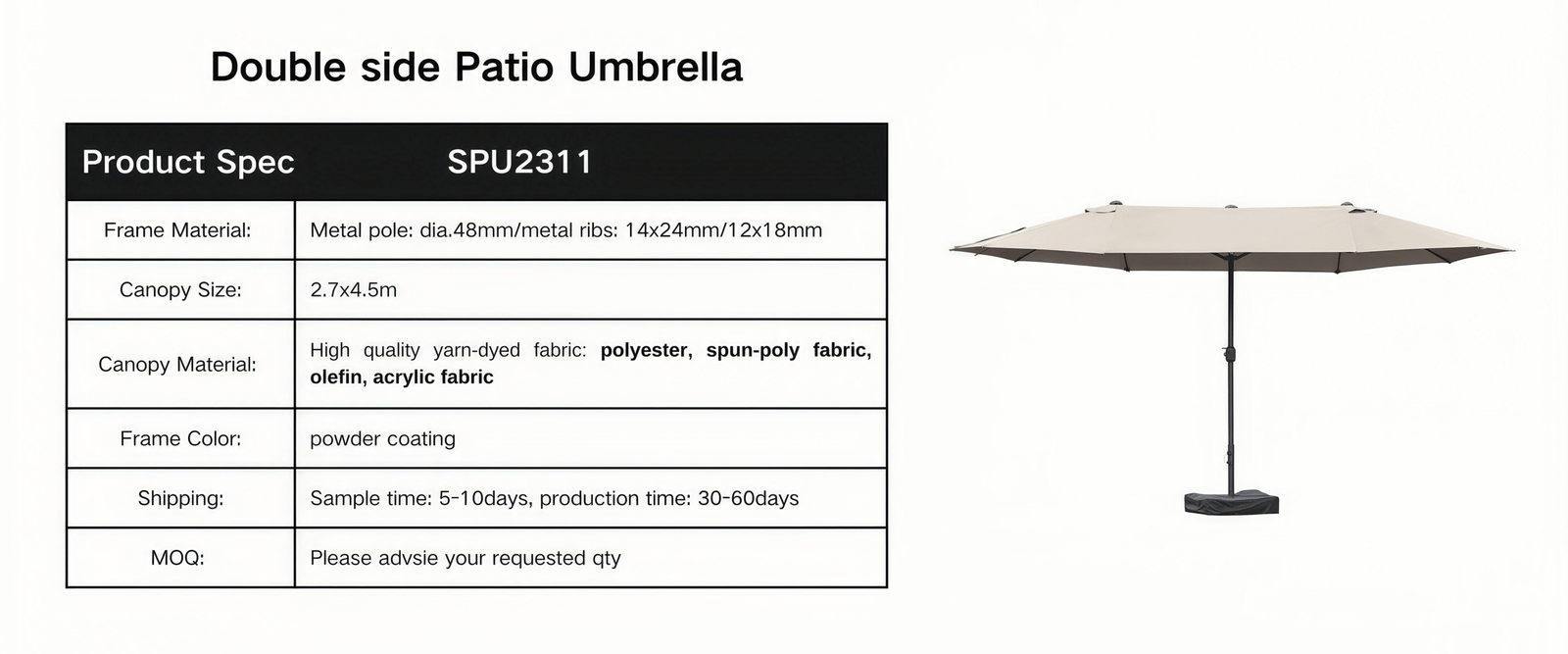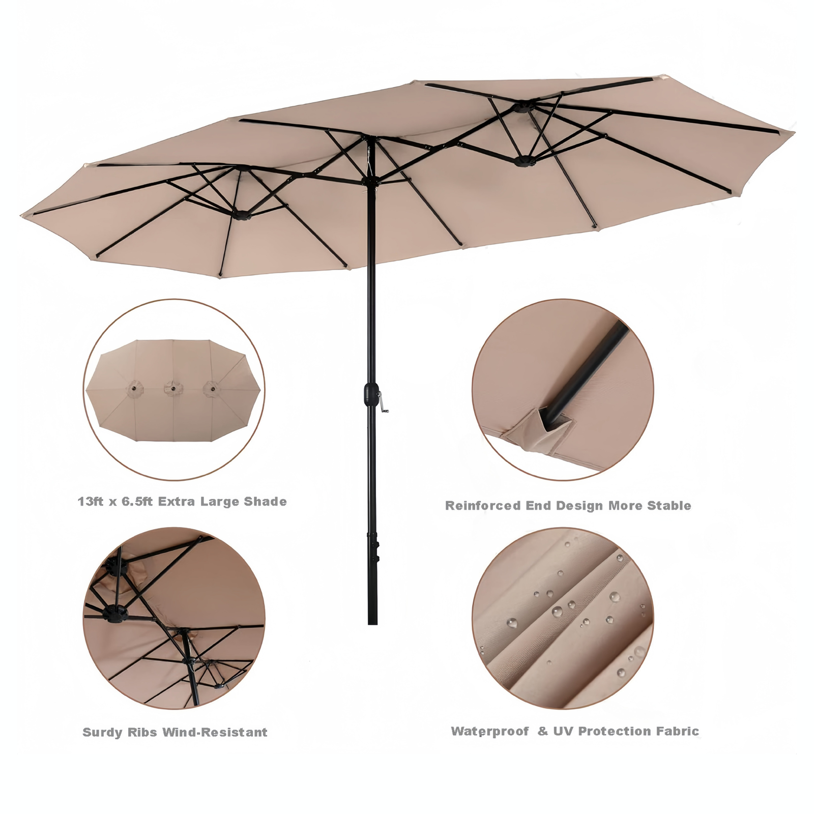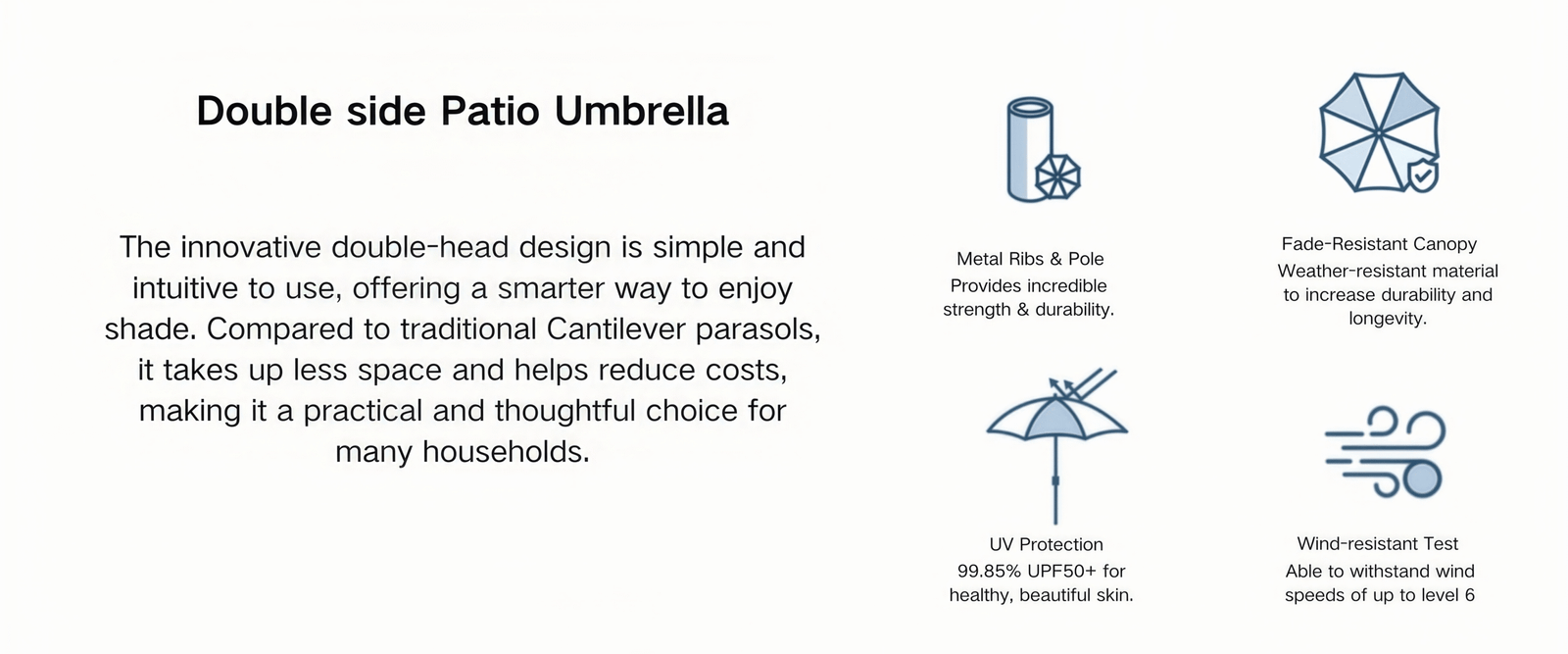 The innovative double-head design is simple and intuitive to use, offering a smarter way to enjoy shade. Compared to traditional Cantilever parasols, it takes up less space and helps reduce costs,making it a practical and thoughtful choice for many households.