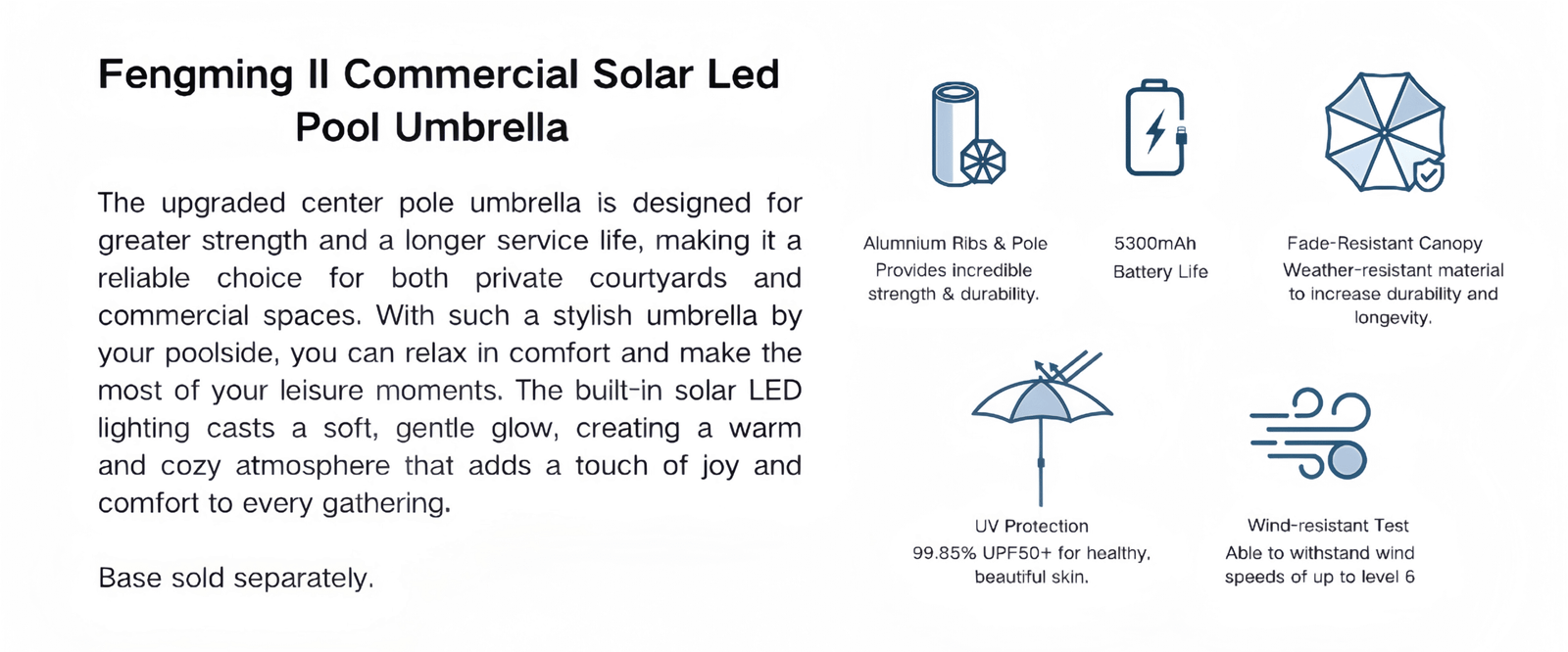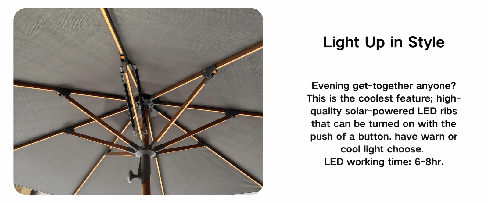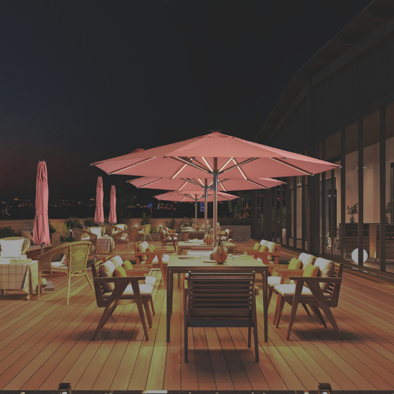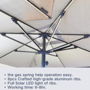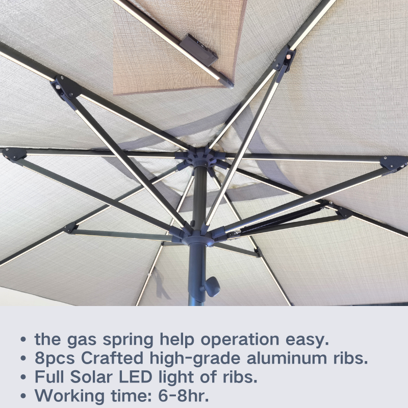 The upgraded center pole umbrella is designed for greater strength and a longer service life, making it a reliable choice for both private courtyards and commercial spaces. With such a stylish umbrella by your poolside, you can relax in comfort and make the most of your leisure moments. The built-in solar LED lighting casts a soft, gentle glow, creating a warm and cozy atmosphere that adds a touch of joy and comfort to every gathering.