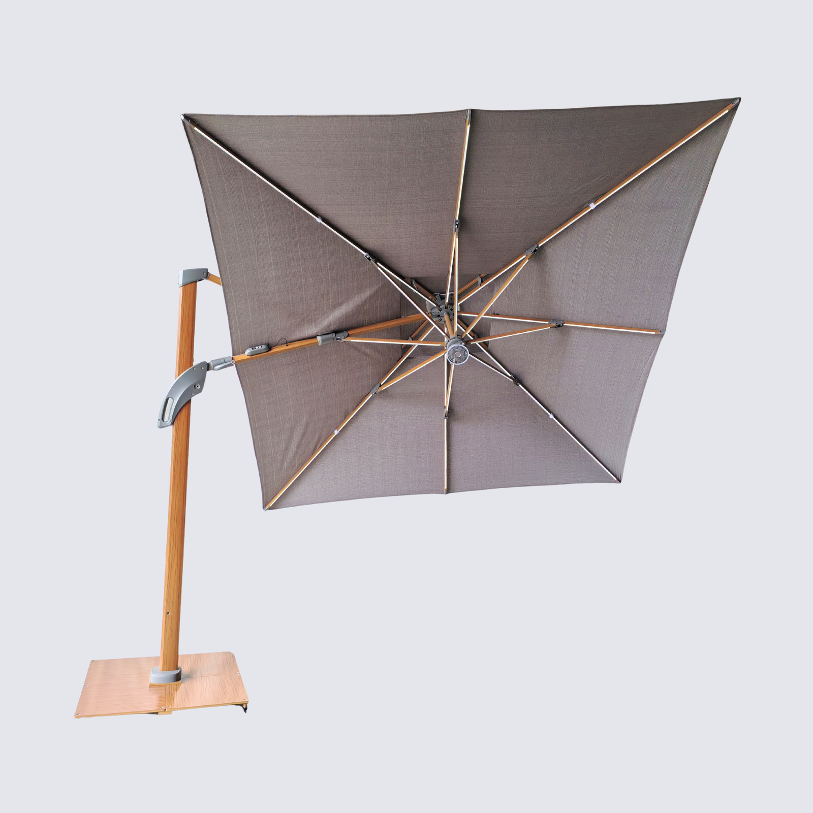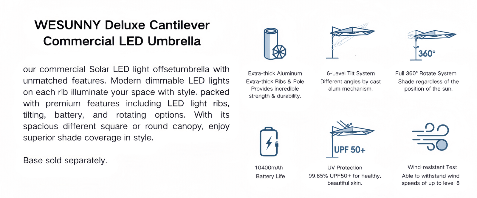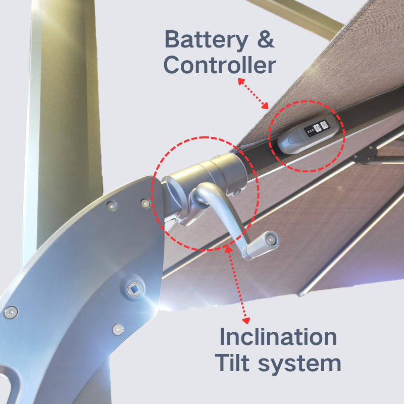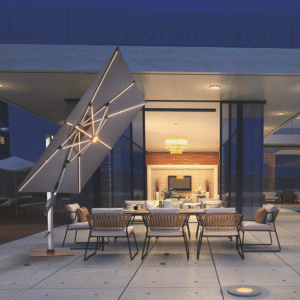 our commercial Solar LED light offset umbrella with unmatched features. Modern dimmable LED lights on each rib illuminate your space with style. packed with premium features including LED light ribs, tilting, battery, and rotating options. With its spacious different square or round canopy, enjoy superior shade coverage in style.