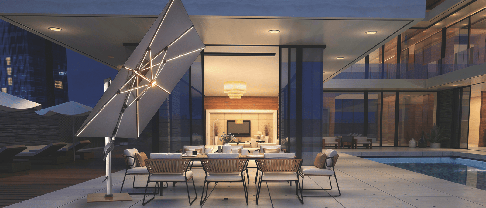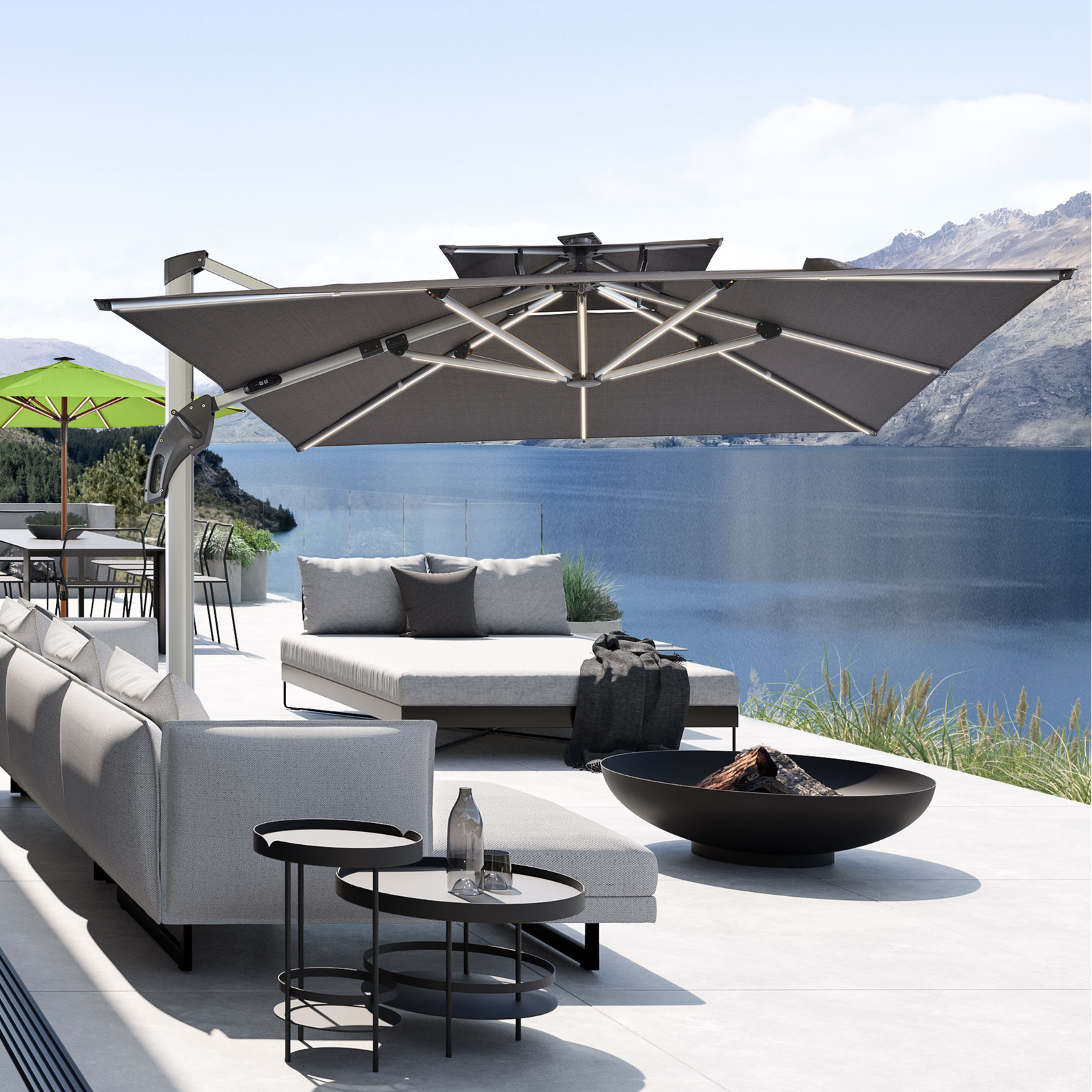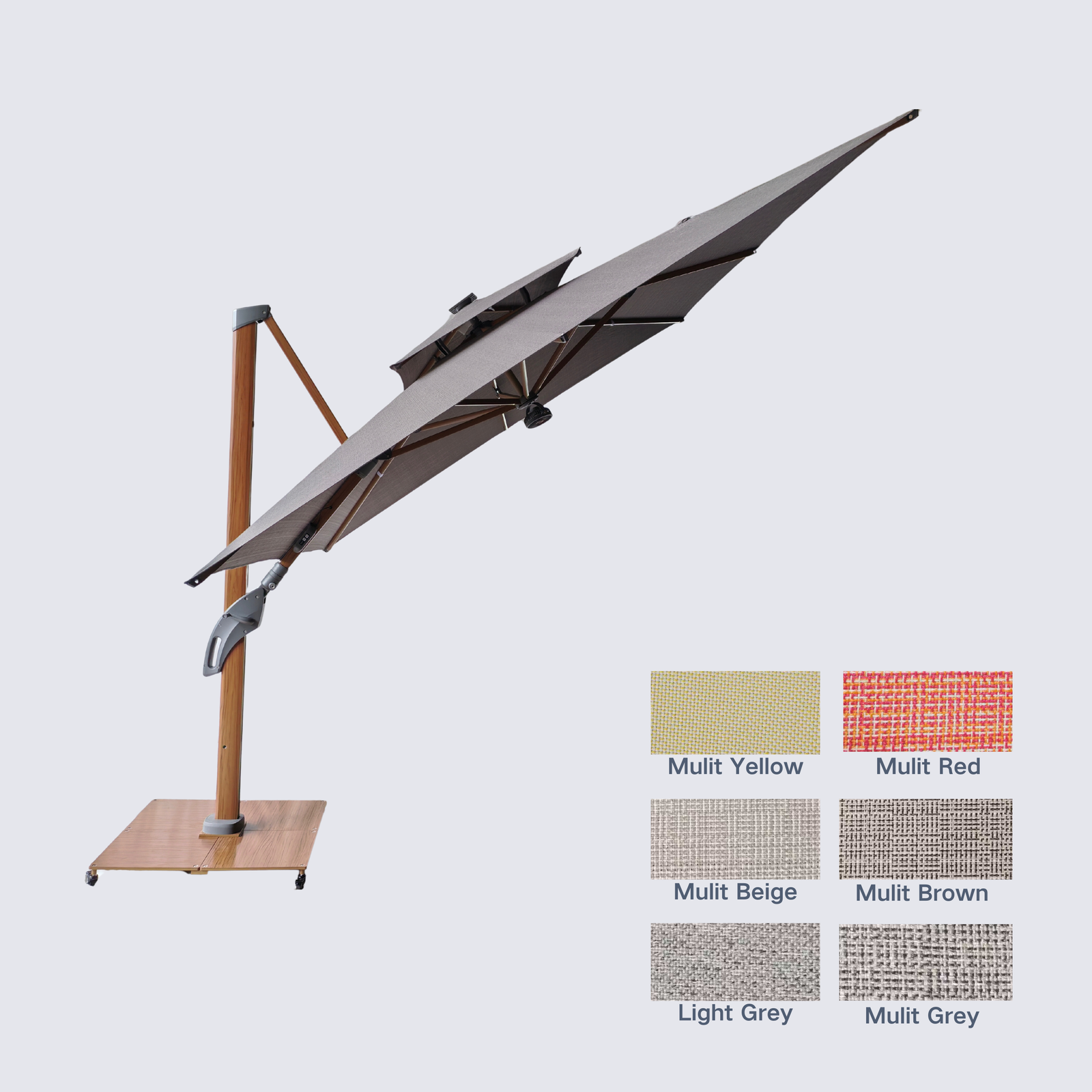 our commercial Solar LED light offset umbrella with unmatched features. Modern dimmable LED lights on each rib illuminate your space with style. packed with premium features including LED light ribs, tilting, battery, and rotating options. With its spacious different square or round canopy, enjoy superior shade coverage in style.
