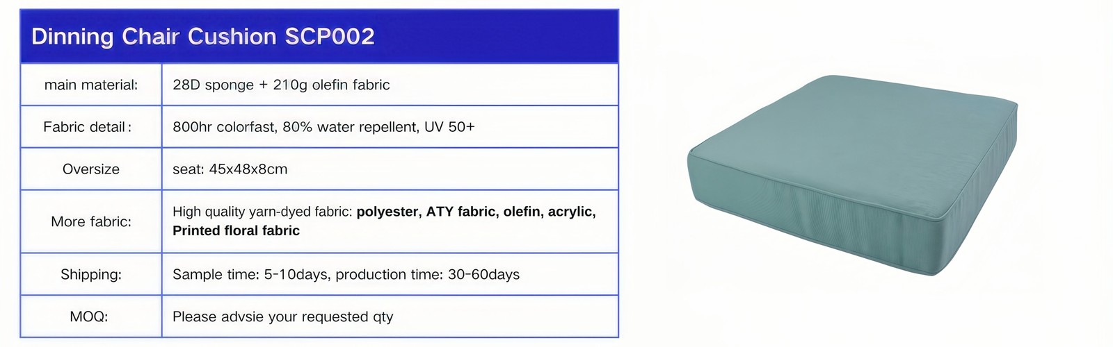 Our outdoor cushions are available in customized sizes and crafted from durable, weather-resistant microfibre material. The insert is filled with 100% sponge, offering superior rebound and a wonderfully comfortable feel. Once you try it, you’ll understand why so many love it. With a range of material options to suit different preferences, and compressed packaging designed to reduce shipping costs, we make it easier and more affordable for you to enjoy outdoor comfort.