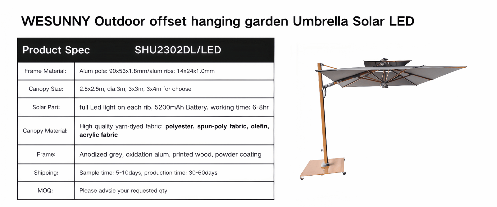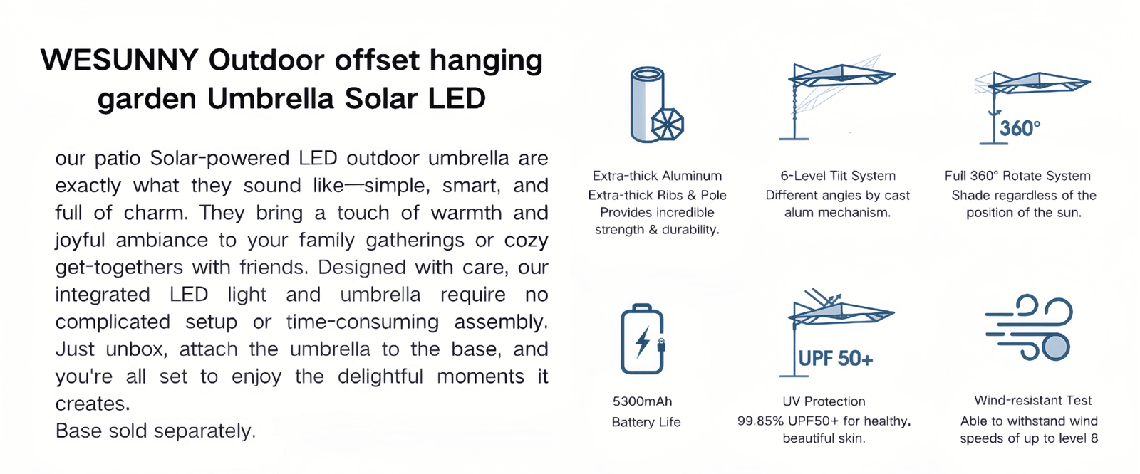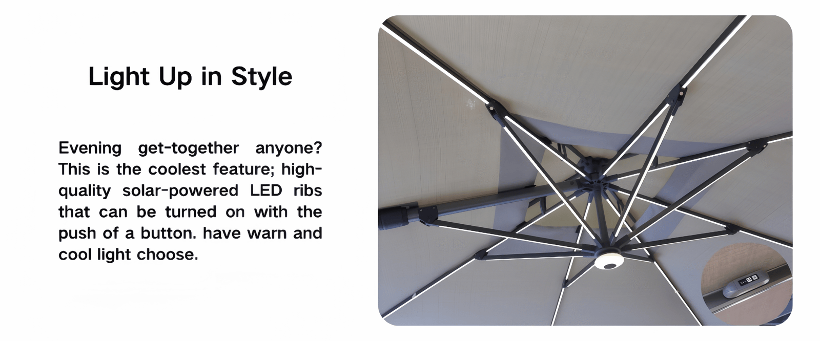 our patio Solar-powered LED outdoor umbrella are exactly what they sound like–simple, smart, and full of charm. They bring a touch of warmth and joyful ambiance to your family gatherings or cozy get-togethers with friends. Designed with care, our integrated LED light and umbrella require no complicated setup or time-consuming assembly. Just unbox, attach the umbrella to the base, and you’re all set to enjoy the delightful moments it creates.
